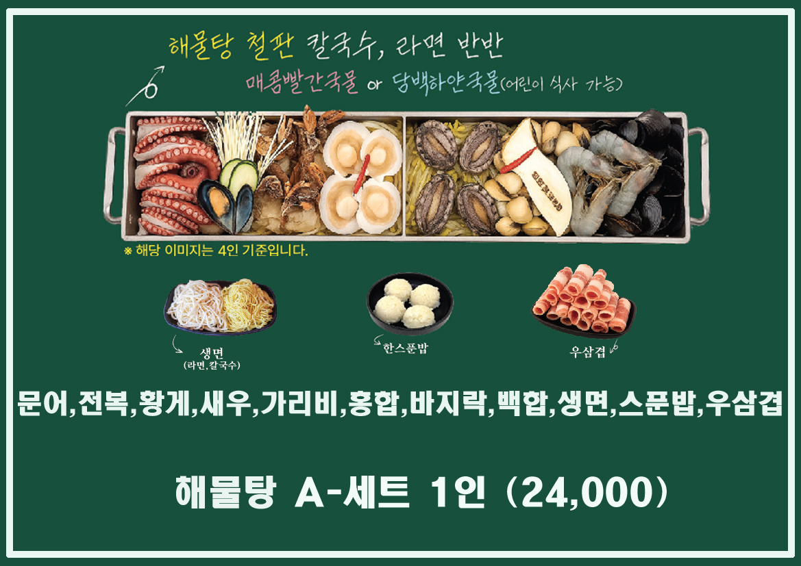 문어,전복,새우,황게,가리비,홍합,바지락,백합,생면,스푼밥,우삼겹.