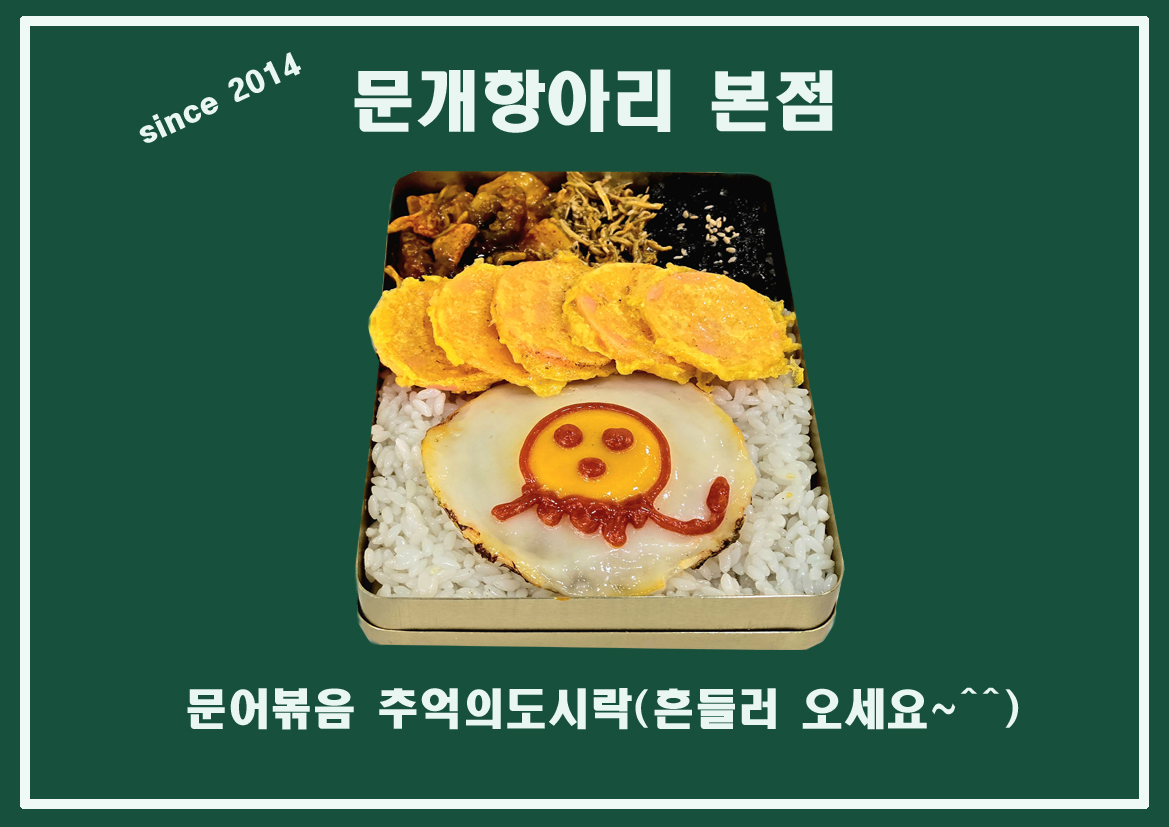 2025년 신메뉴. 문어볶음 추억의 도시락.. 아이도 먹을수 있고 어른들께는 추억을 회상할수있는 양은 도시락 입니다. 문어볶음×김치볶음×후라이×볶음멸치×쏘세지×김자반 문개항아리 본점 도시락 흔들러오세요^^